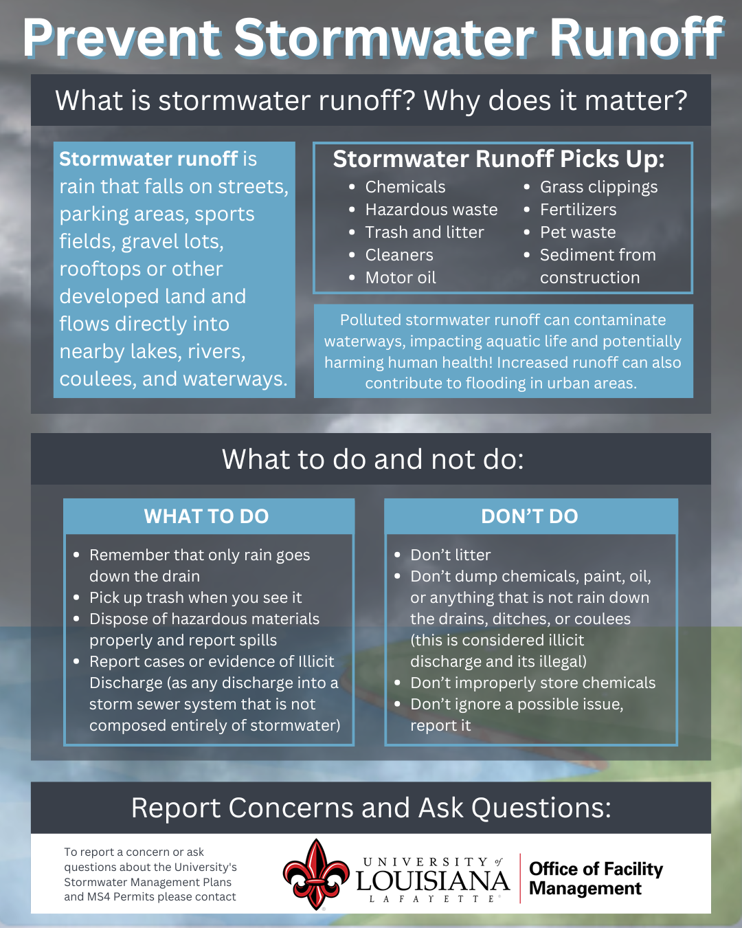 The Office of Facility Management manages the University's SWMP and MS4 Permit. A good rule of thumb to remember is "only rain down the drain". If you have any questions or have any violations to report please contact Facilities.